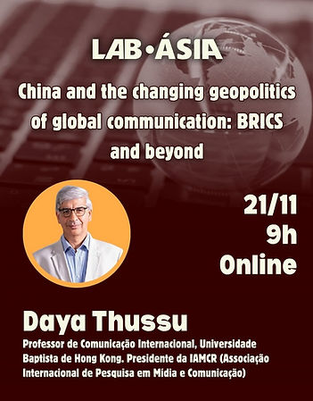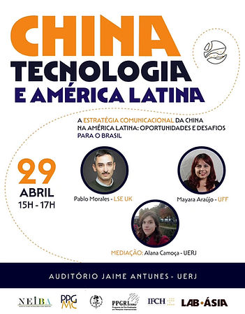 No dia 29 de abril, das 15h às 17h, foi realizada a palestra “A Estratégia Comunicacional da China na América Latina: Oportunidades e Desafios para o Brasil”, com o Prof. Dr. Pablo Morales (LSE UK) e a Profa. Dra. Mayara Araújo (UFF). A mediação será realizada pela Profa. Dra. Alana Camoça (UERJ).