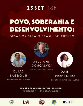 Num cenário de tensão na geopolítica mundial e seguidos ataques à soberania nacional, teremos o prazer de realizar na nossa Universidade, um rico debate sobre os desafios para o Brasil do Futuro, com convidados muito especiais: Dani Monteiro, deputada estadual; Elias Jabbour, professor do FCE e Williams Gonçalves, professor do DRI.
